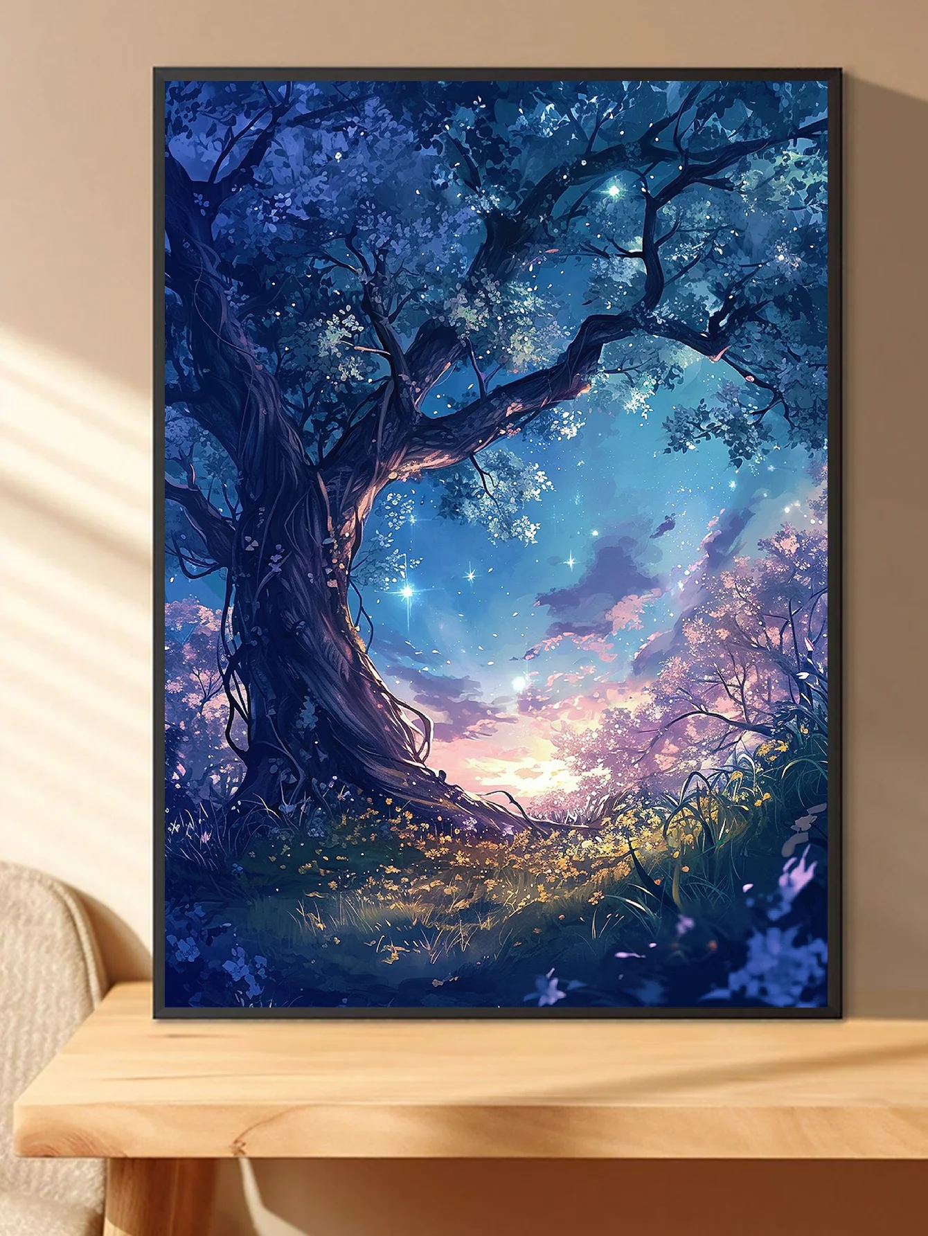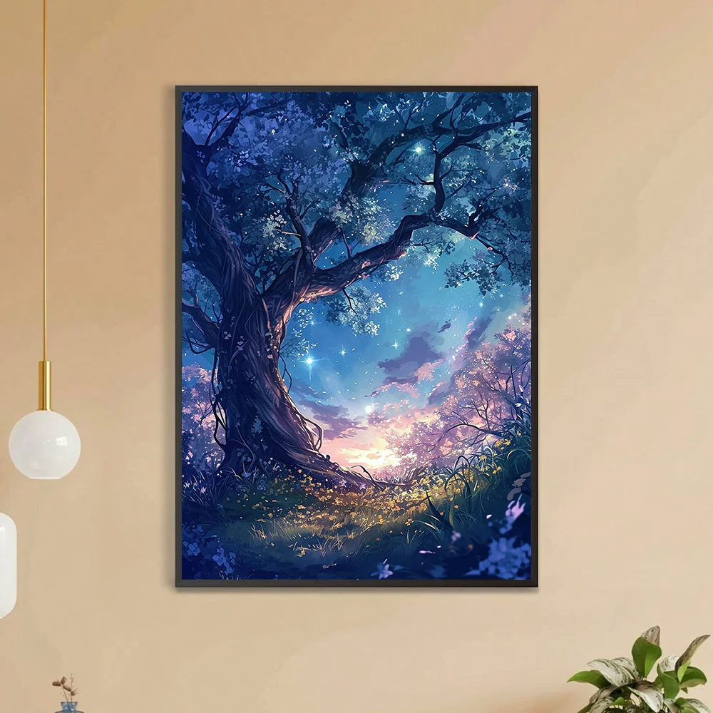 Immerse yourself in a calming scene of a beautifully twisted tree reaching up to a moonlit sky. This beautifully designed diamond painting captures a sense of peace and beauty.